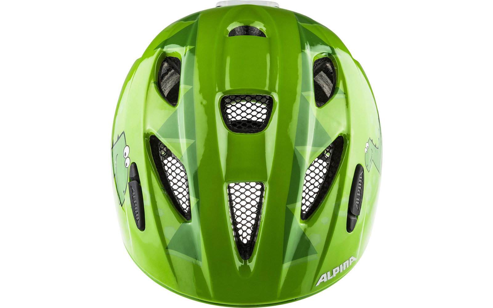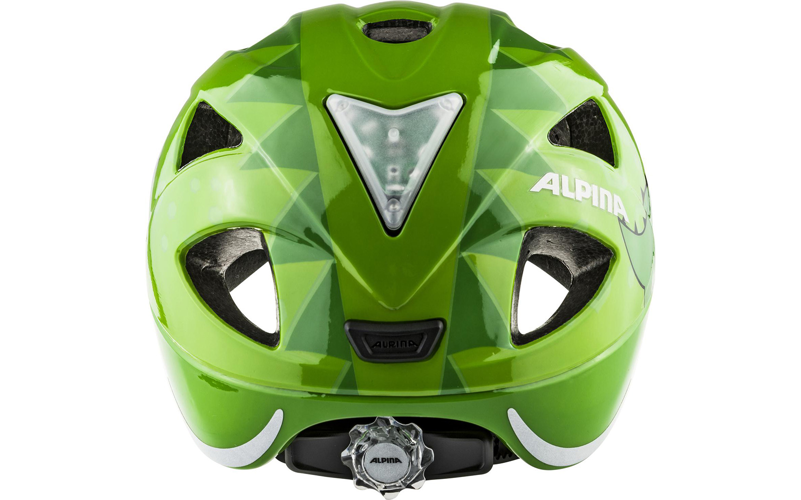 Der grüne Kinderhelm mit Dino-Motiv bietet zahlreiche Detaillösungen und kombiniert maximale Sicherheit mit maximalem Komfort. Ein leichter Helm, dank Inmold-Fertigung und ein perfekter Sitz dank „Run System Classic Slide“ (Drehrädchen am Hinterkopf). Heißt, das Innenleben passt sich dreidimensional dem Kopf an. Selbst bei den Lüftungsöffnungen hat Alpina hier bedacht, dass keine Sonneneinstrahlung von oben direkt auf den Kopf auftreffen kann, weshalb die Öffnungen leicht seitlich sitzen. Somit gleichzeitig aber für eine gute Belüftung sorgen. Der Hinterkopf-Bereich ist flach gestaltet, was den Komfort beim Tragen im Kinderanhänger oder Kindersitz für die Kleinen erhöht. Reflektieren Elemente sind ebenfalls vorhanden. Bei Bedarf kann am Alpina Ximo auch eine zusätzliches Multi-Fit Light nachgerüstet werden.