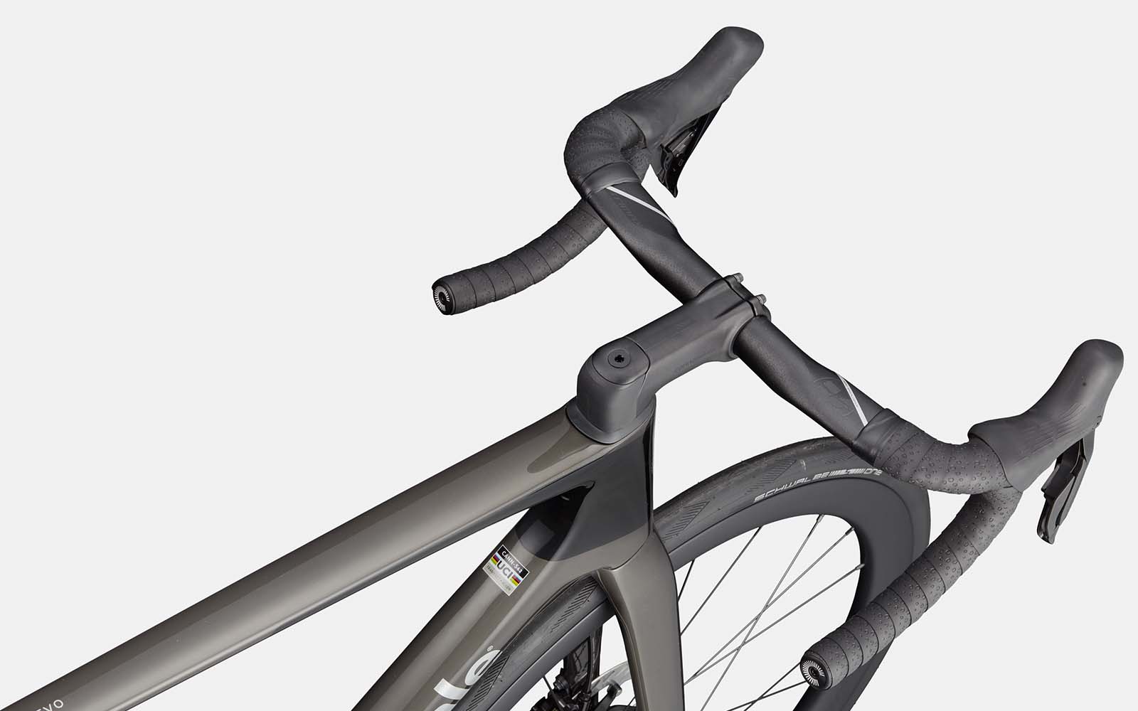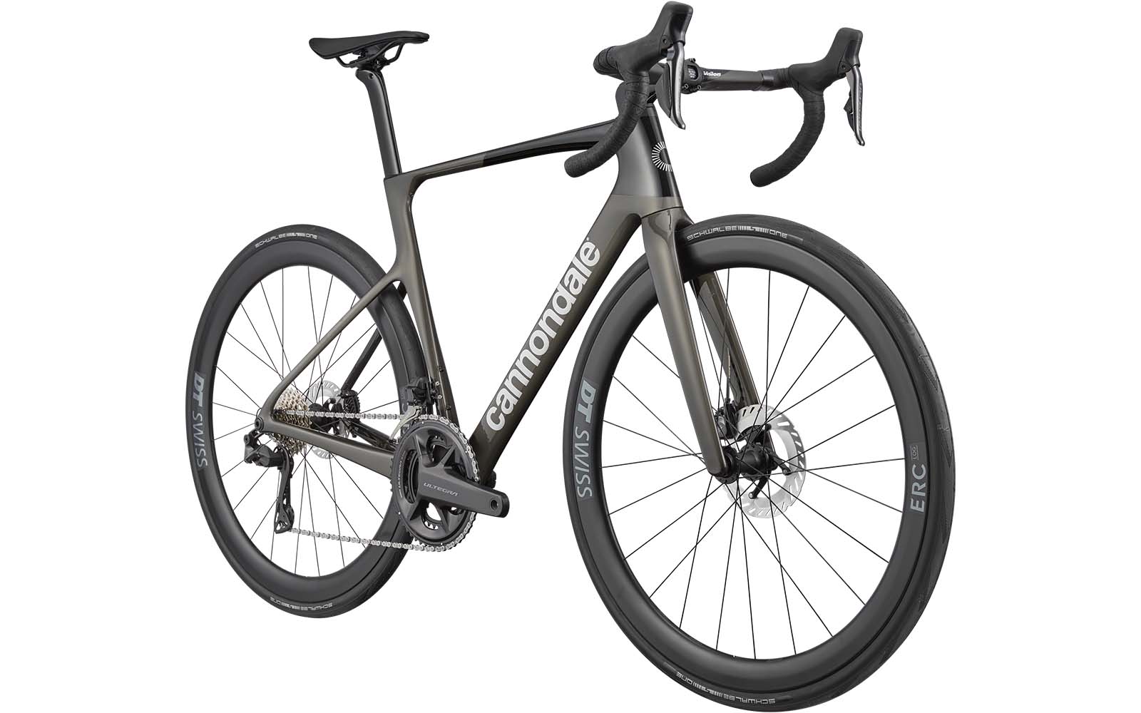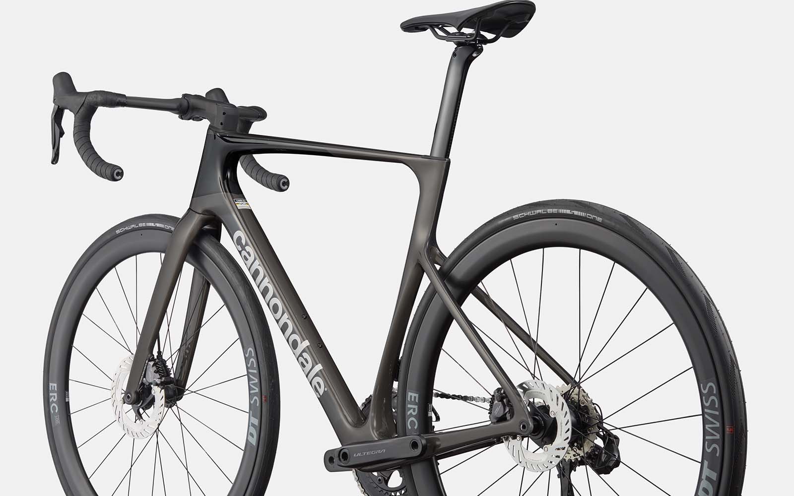 Für die Schaltvorgänge ist die elektronische Shimano Ultegra Di2 2x12-fach-Schaltung zuständig. Auch die Bremsen kommen aus der gleichnamigen Serie. Hier darf natürlich auch ein DT Siwss Carbon-Laufradsatz nicht auf der Ausstattungsliste fehlen, bestückt mit Schwalbe One TLR Reifen. Und dann wäre da noch das aerodynamische Cockpit: Vision Trimax Aero Carbonlenker und Cannondale Aero Carbon Stütze.