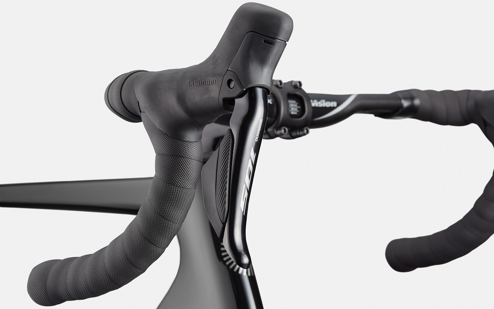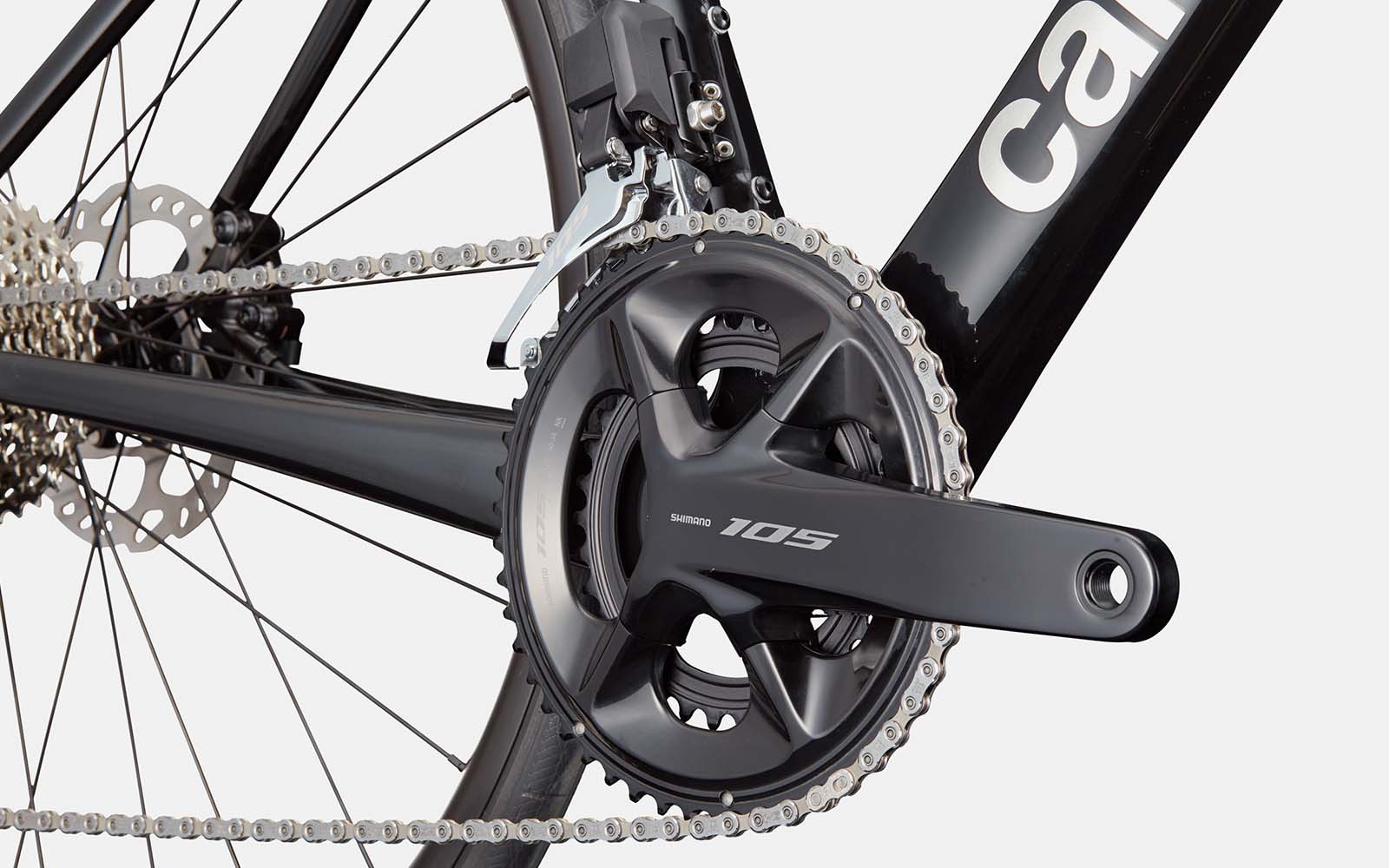 Für die Schaltvorgänge ist die elektronische Shimano 105 Di2 12-fach-Schaltung zuständig. Auch die Bremsen kommen aus der gleichnamigen Serie. Leichte, breite DT Swiss R470 Aluminiumfelgen bestückt mit Vittoria Reifen. Und dann wäre da noch das aerodynamische Cockpit: Vision Trimax Aero Lenker und Cannondale C1 Conceal Vorbau.