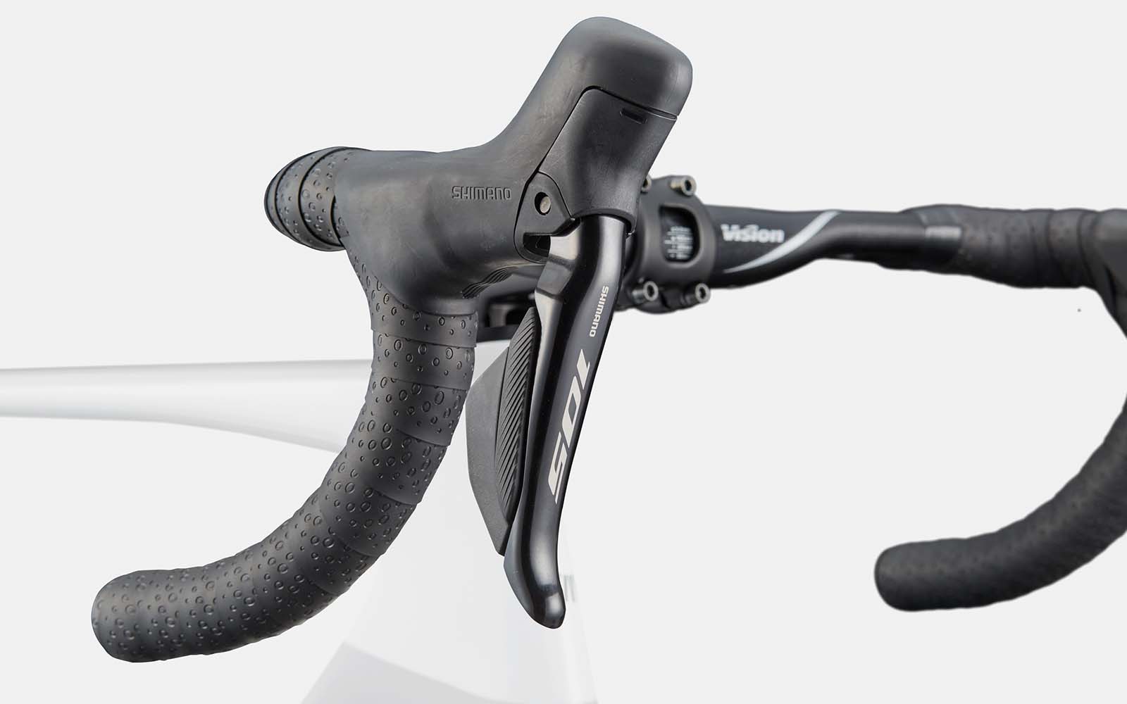 Für die Schaltvorgänge ist die elektronische Shimano 105 Di2 2x12-fach-Schaltung zuständig. Auch die Bremsen kommen aus der gleichnamigen Serie. Hier darf natürlich auch ein Carbon-Laufradsatz von Vision nicht auf der Ausstattungsliste fehlen, bestückt mit Schwalbe One TLR Reifen. Und dann wäre da noch das aerodynamische Cockpit: Vision Trimax Aero Carbonlenker und Cannondale Aero-Stütze.
