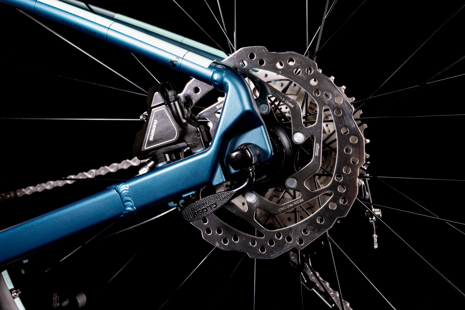 Der hochwertige Access WS Rahmen (hier in einem schönen Blauton) hat ein neues Design und eine überarbeitete Geometrie erhalten für 2022, noch dazu abgestimmt auf die weibliche Anatomie selbstverständlich. Das Oberrohr sitzt recht niedrig und der supercleane Look besticht sofort. Das liegt am Smooth Welding Verfahren, was die Verbindungen am Steuerrohr und Sattelstützprofil angeht. Das Access WS besteht aus leichtem und robustem Aluminium Lite. Die Züge sind schön im Inneren verlegt. Durch das Size Split System findet jeder Fahrer das passende Rad in ihrer Größe (hier setzt Cube je nach Rahmengröße auf 27,5 Zoll für XS und S Modelle oder 29 Zoll Laufräder ab Größe M).