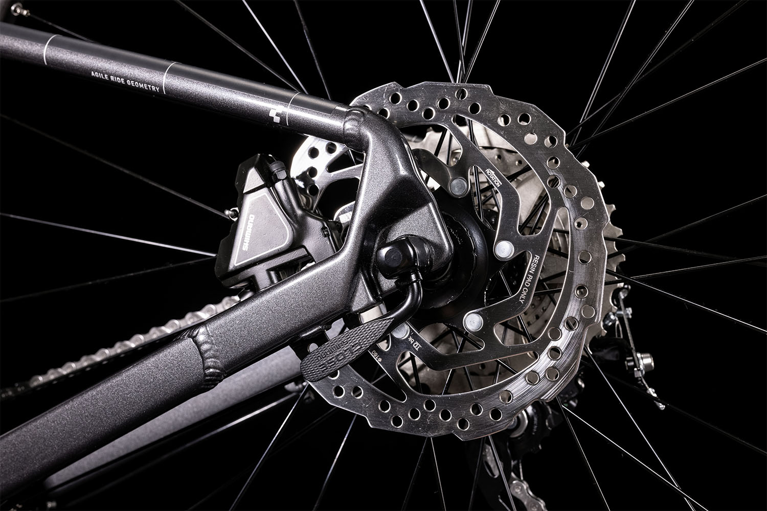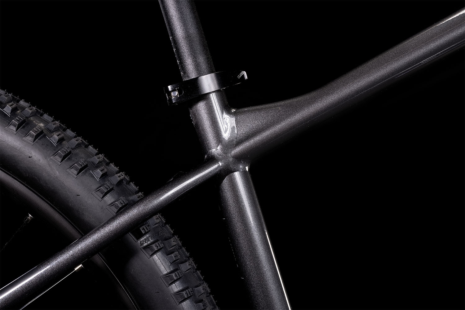 Der hochwertige Rahmen hat ein neues Design und eine überarbeitete Geometrie erhalten für 2022. Hier besticht der supercleane Look sofort. Das liegt am Smooth Welding Verfahren, was die Verbindungen am Steuerrohr und Sattelstützprofil angeht. Das Aim SL besteht aus leichtem und robustem Aluminium Lite. Die Züge sind schön im Inneren verlegt. Montagepunkte für ACID Schutzbleche und Gepäckträger hat man auch bedacht. Durch das Size Split System findet jeder Fahrer das passende Rad in seiner Größe (hier setzt Cube je nach Rahmengröße auf 27,5 Zoll für XS und S Modelle oder 29 Zoll Laufräder ab Größe M).