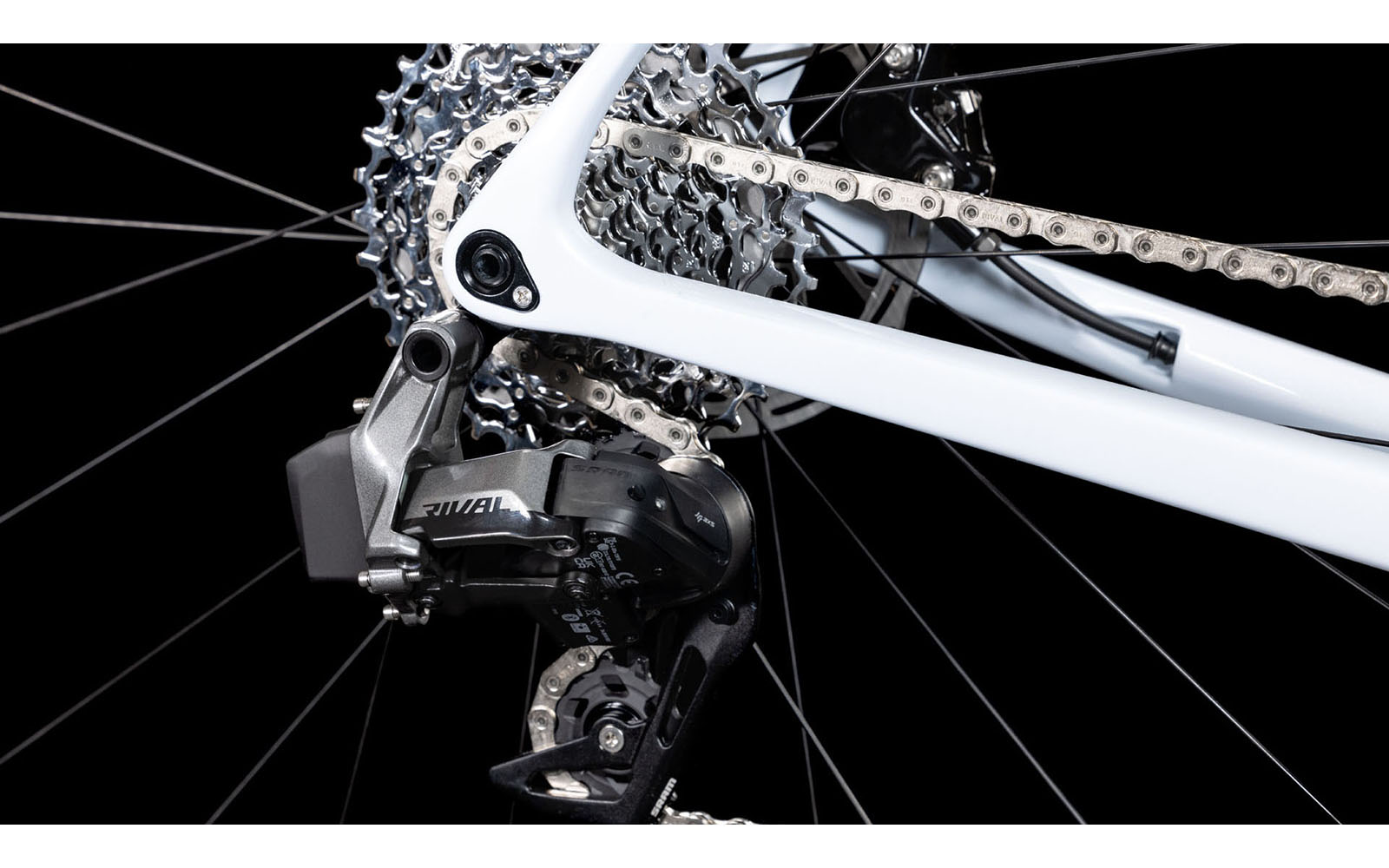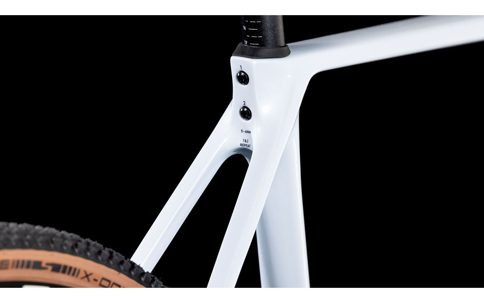 Ein leichter Carbonrahmen spart hier richtig Gewicht. Farblich in Weiß/Blau. Eine Klasse für sich, wie Cube sagt. Neben dem Carbonrahmen natürlich auch mit Vollcarbongabel. Rahmen und Gabel absorbieren sämtliche Vibrationen und schnell aufeinanderfolgende Schläge vom Untergrund, so können Sie sich voll auf Ihr Rennen und die Strecke konzentrieren. Die Züge sind innen verlegt, somit gut vor Schlamm und Dreck geschützt und auch optisch ein Pluspunkt. Dazu die semi-Integrierte Sattelklemmung.