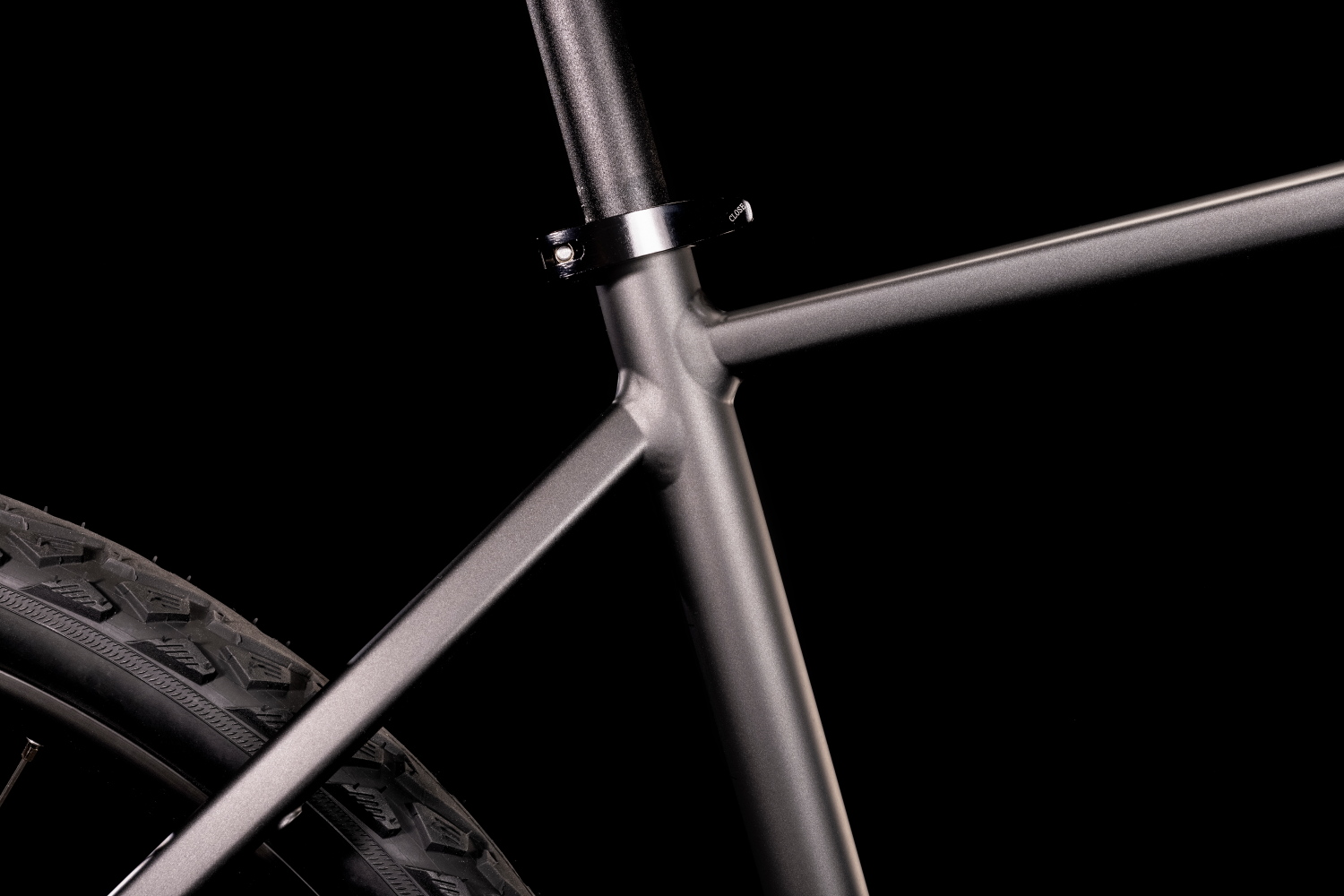 Grauer, clean designter Diamantrahmen aus High Performance Aluminium. Die Rahmenform lässt das Rad gleich sportlicher wirken. Doppelt konifizierte Aluminiumrohre halten das Gewicht niedrig, bieten jedoch die nötige Belastbarkeit und Langlebigkeit. Auch hier wurde mit dem Cube´s Smooth Welding Verfahren gearbeitet. Die Schalt- und Bremszüge sind nach innen verlegt. Die Reifenfreiheit lässt bis zu 50mm breite Reifen zu, was den Fahrkomfort erhöht.Das Anbringen von Schutzblechen oder das Nachrüsten eines Gepäckträgers sind selbstverständlich möglich.