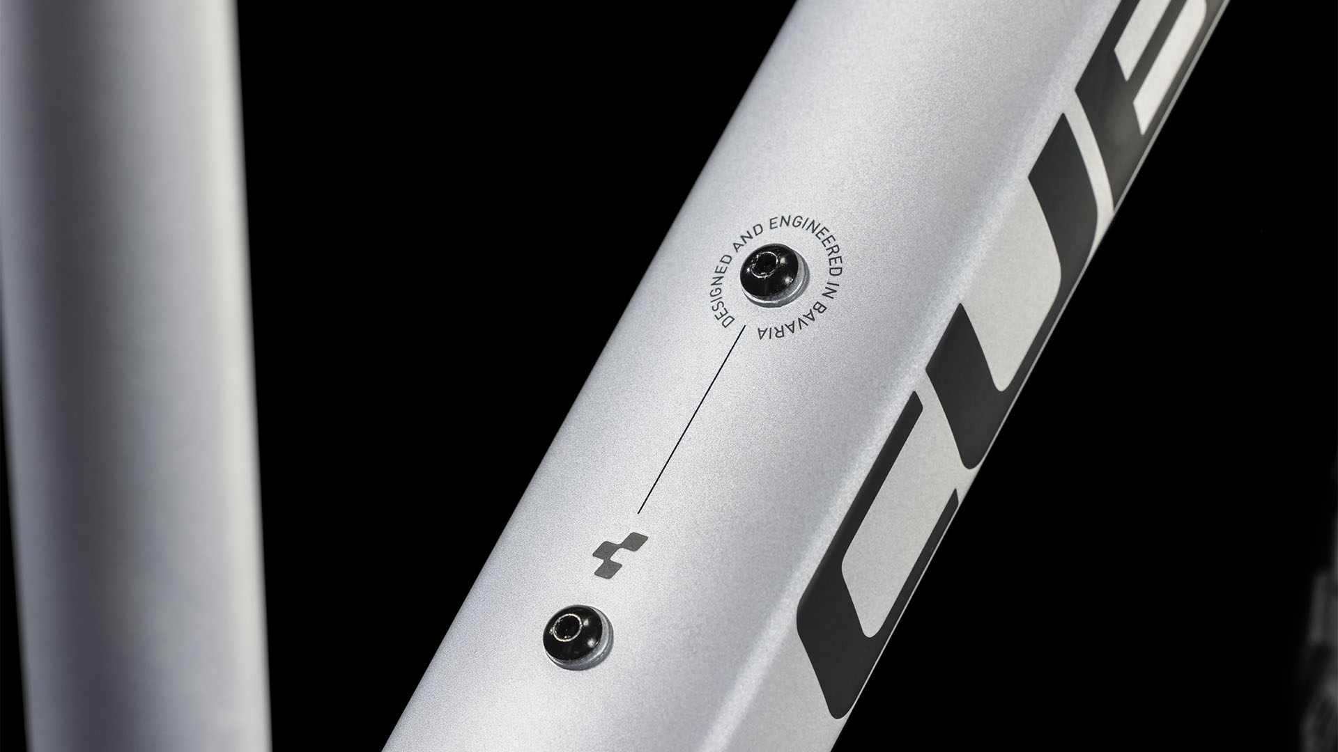 Clean designter, silberner Trapez-Rahmen (Oberrohr diagonal abfallend) aus High Performance Aluminium. Dies erleichtert das Auf-/Absteigen und lässt mehr Freiraum beim Thema Überstand.