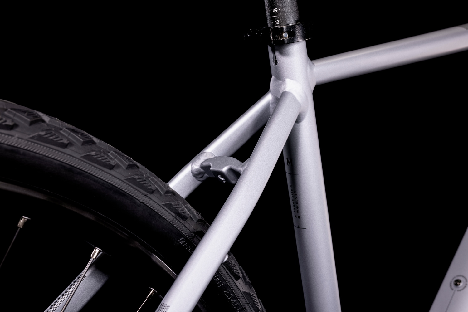 Clean designter, silberner Diamant-Rahmen aus High Performance Aluminium. Doppelt konifizierte Aluminiumrohre halten das Gewicht niedrig, bieten jedoch die nötige Belastbarkeit und Langlebigkeit. Die Reifenfreiheit lässt bis zu 50mm breite Reifen zu – was den Fahrkomfort erhöht. Smooth Welding Verfahren, Befestigungspunkte für Gepäckträger und Schutzbleche sind bedacht und die Schalt- und Bremszüge innen verlegt. Farbe: polarsilver´n´black.