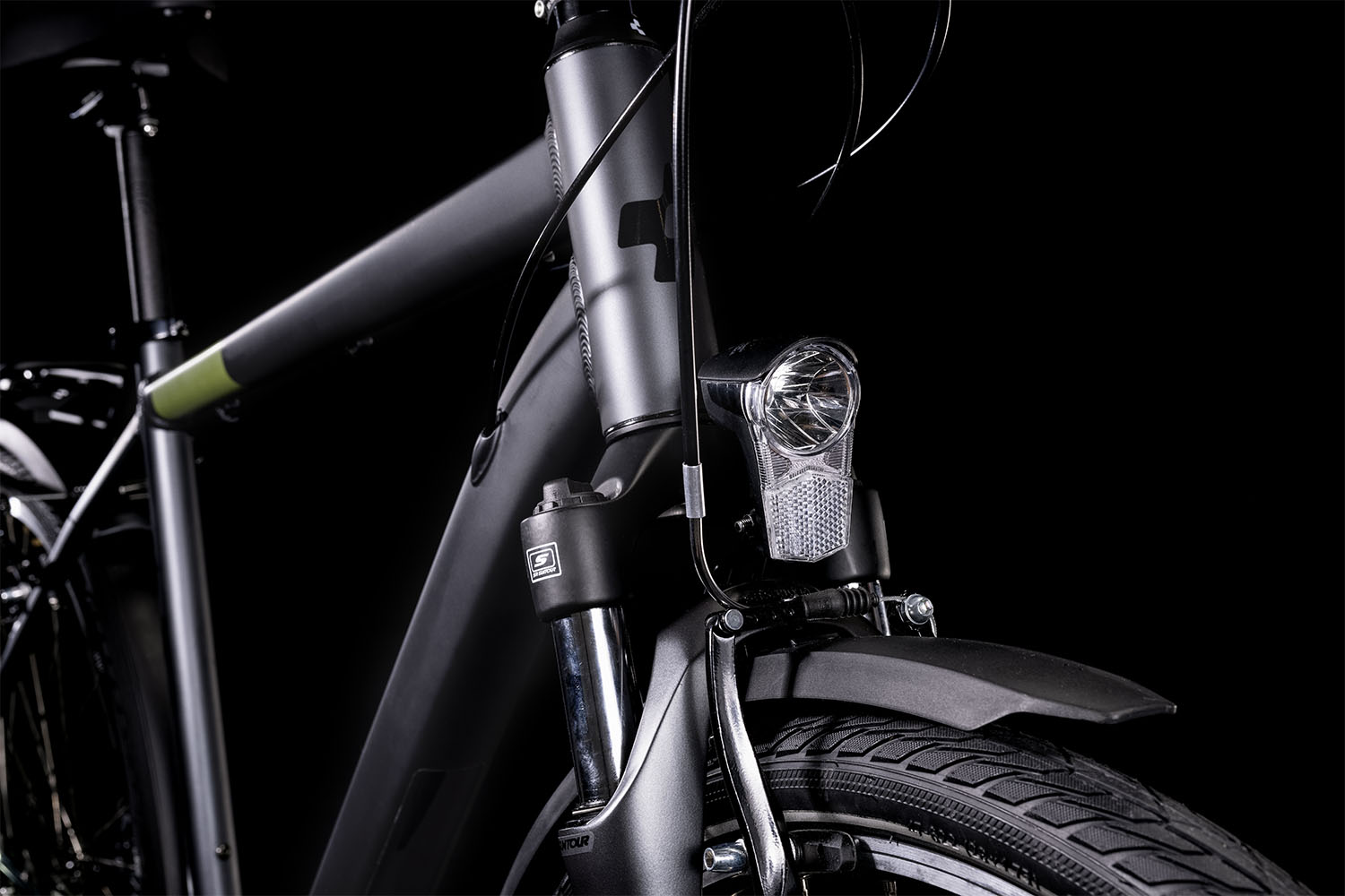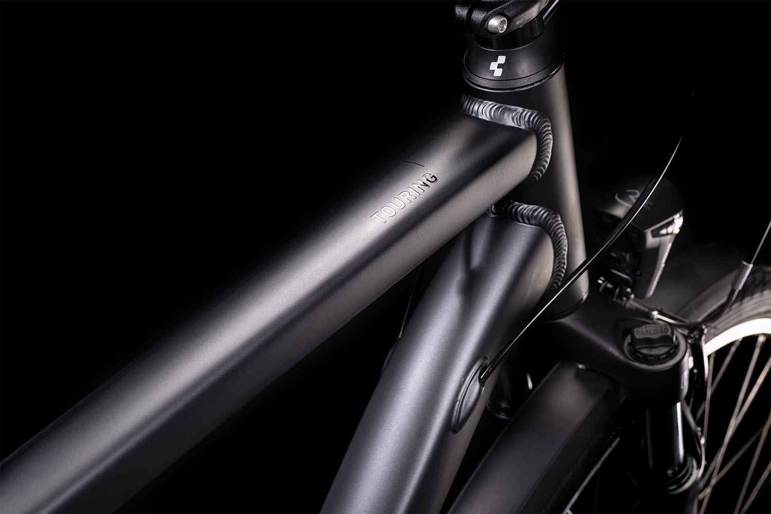 Hochwertiger, leichter Rahmen aus doppelt konifizierten Aluminiumrohren. Hier in der Version mit Diamantrahmen (sportlich, klasssiche Form) in einem Grauton. Cube´s Efficient Comfort Geometry sorgt dabei für Leichtigkeit, Effizienz und Fahrkomfort, was sich besonders an langen Tagen im Sattel bezahlt macht. Elegant ist der Gepäckträger integriert und die Züge innen verlegt.