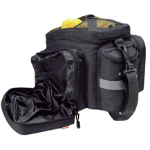 Zusätzlich mit ausklappbaren Seitentaschen, Deckel mit Netzfächern und kombiniertem Tragegriff/Spanngurt zum Verzurren von Bekleidung. Mit Reflektor, Lampenhalter, abnehmbarem Schultergurt und Regenhaube. Die Tasche wird einfach auf den Racktime-Träger geschoben und verriegelt automatisch. Zum komfortablen Abnehmen einfach die rote Taste drücken!Seitentaschen sind nur an Gepäckträgern mit seitlicher Abstützung verwendbar.