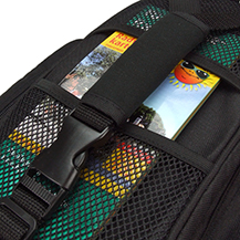 ausklappbaren Seitentaschen, Deckel mit Netzfächern und kombiniertem Tragegriff/Spanngurt