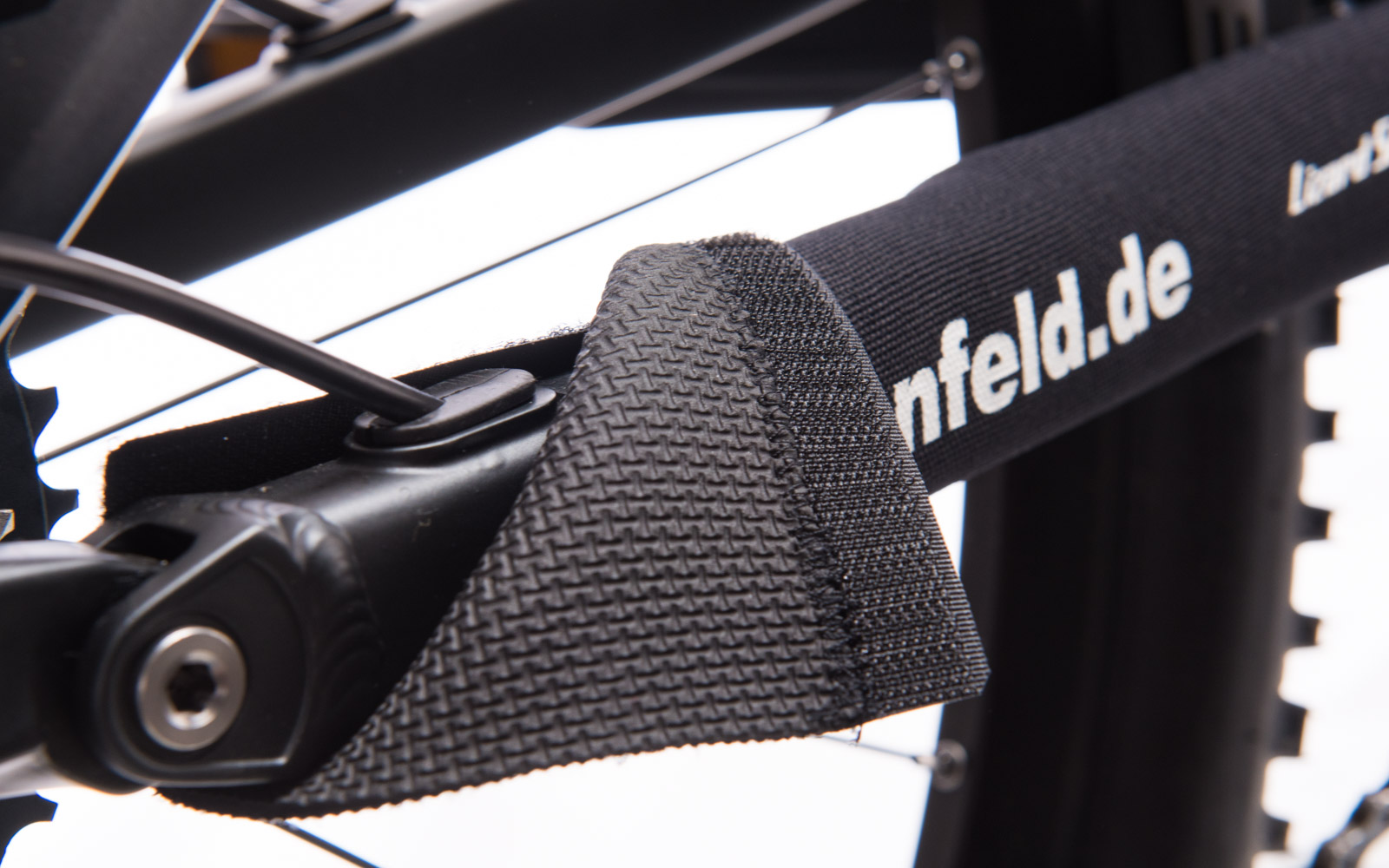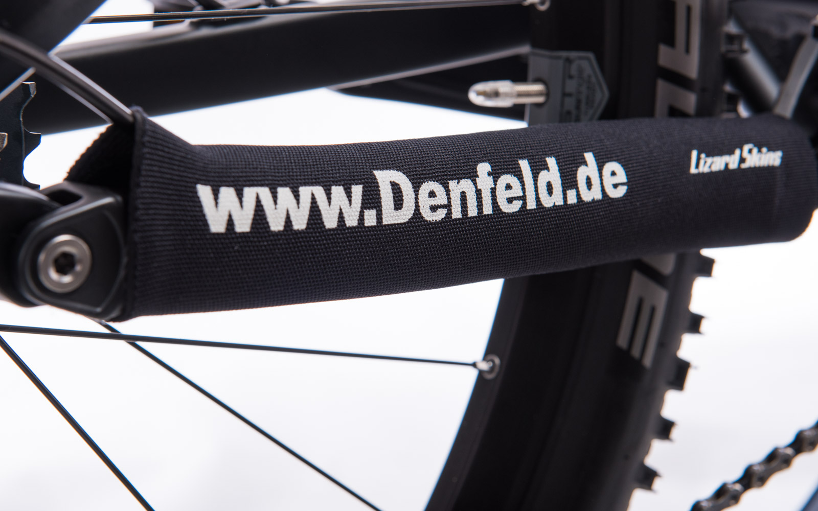 Der Lizard Skins Kettenstrebenschutz mit www.Denfeld.de Aufdruck. Das robuste, hochwertige Neopren schützt die Kettenstrebe vor Kettenschlägen und seine breite Klettfläche sorgt für besten Halt.