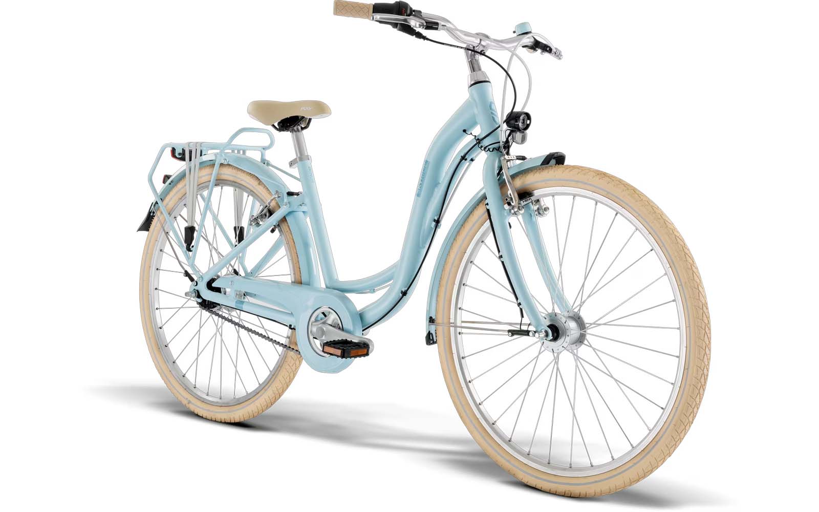 Leichter Aluminiumrahmen mit stoßfester Pulverlackierung und Aluminium-Gabel. Farblich in einem hellen Blau (retro-blue).