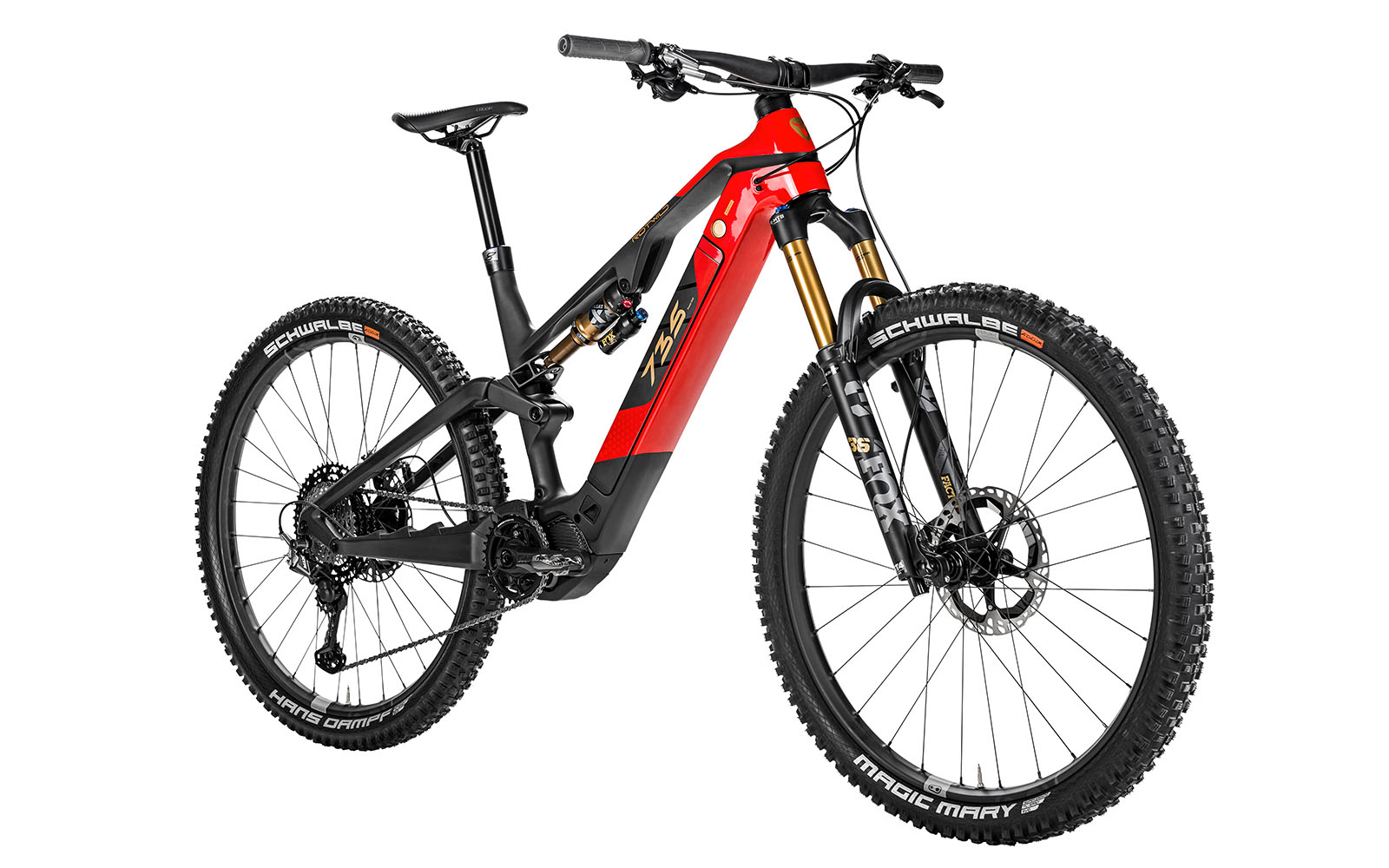 Vollcarbonrahmen (High Modulus Carbon Fasern), handgefertigt. Heißt hier sind Hauptrahmen sowie Schwinge und sogar Motorgehäuse aus Carbon. (Lediglich die Dämpferaufnahme ist aus Alu). Sportliche Sitzposition, tiefe Front, viel Federweg! (Flacher Lenkwinkel von 65,5 Grad). Genau so war es gedacht, hier geht es nicht nur um rasante Bergab-Passagen, denn mit dem Rotwild R.X735 Pro dürfen Sie sich gerne auch bergauf über unwegsames Gelände ziehen. Ein geschmeidig arbeitender Hinterbau sorgt für die nötige Traktion, komme was wolle. Laufradgröße 29 Zoll.