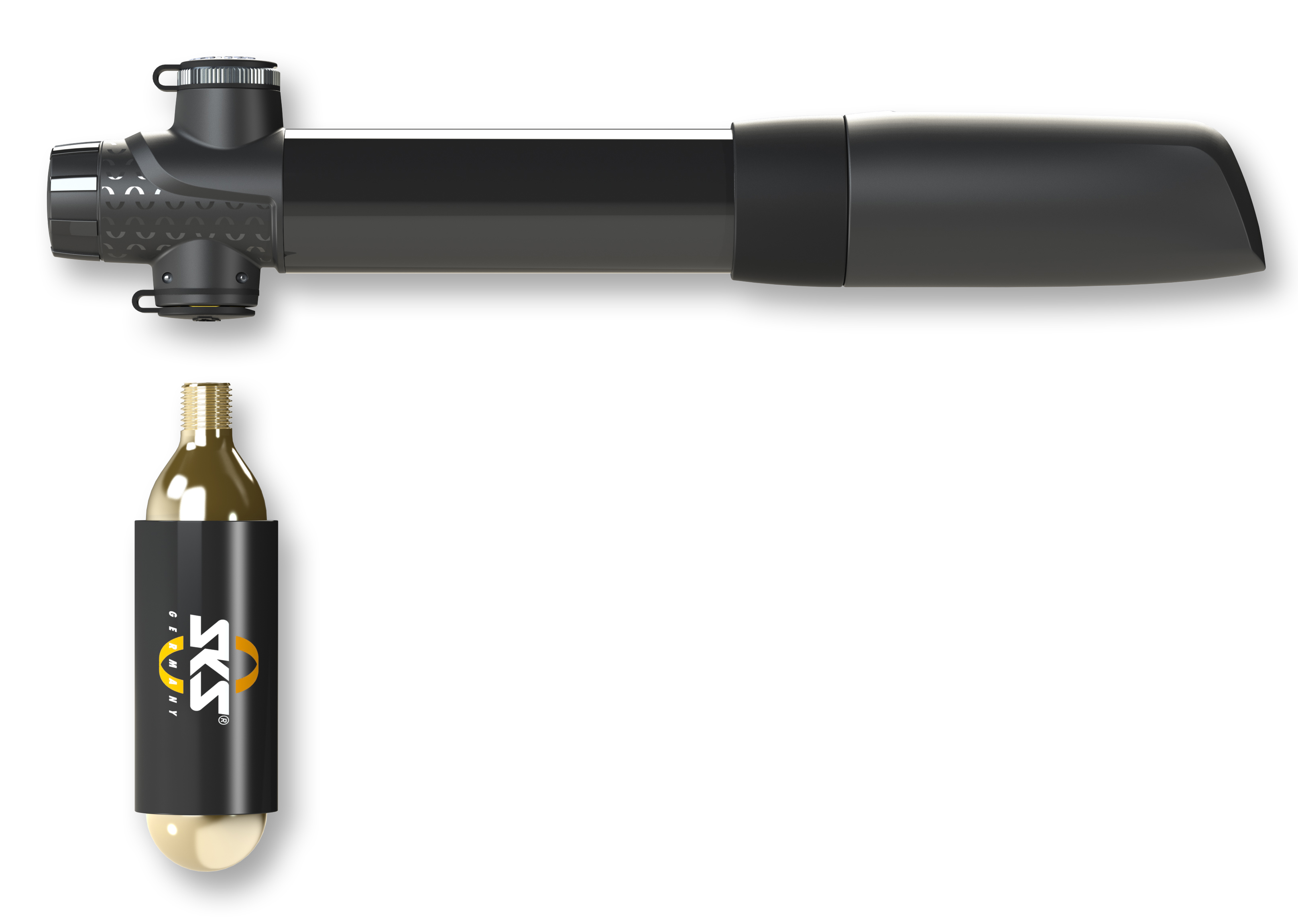 Das kleine Schmuckstück wiegt nur 207g inkl. 16g CO₂ Kartusche. Die Handpumpe bietet max. 5 bar / 73psi.
