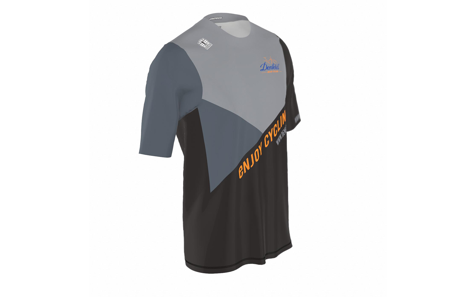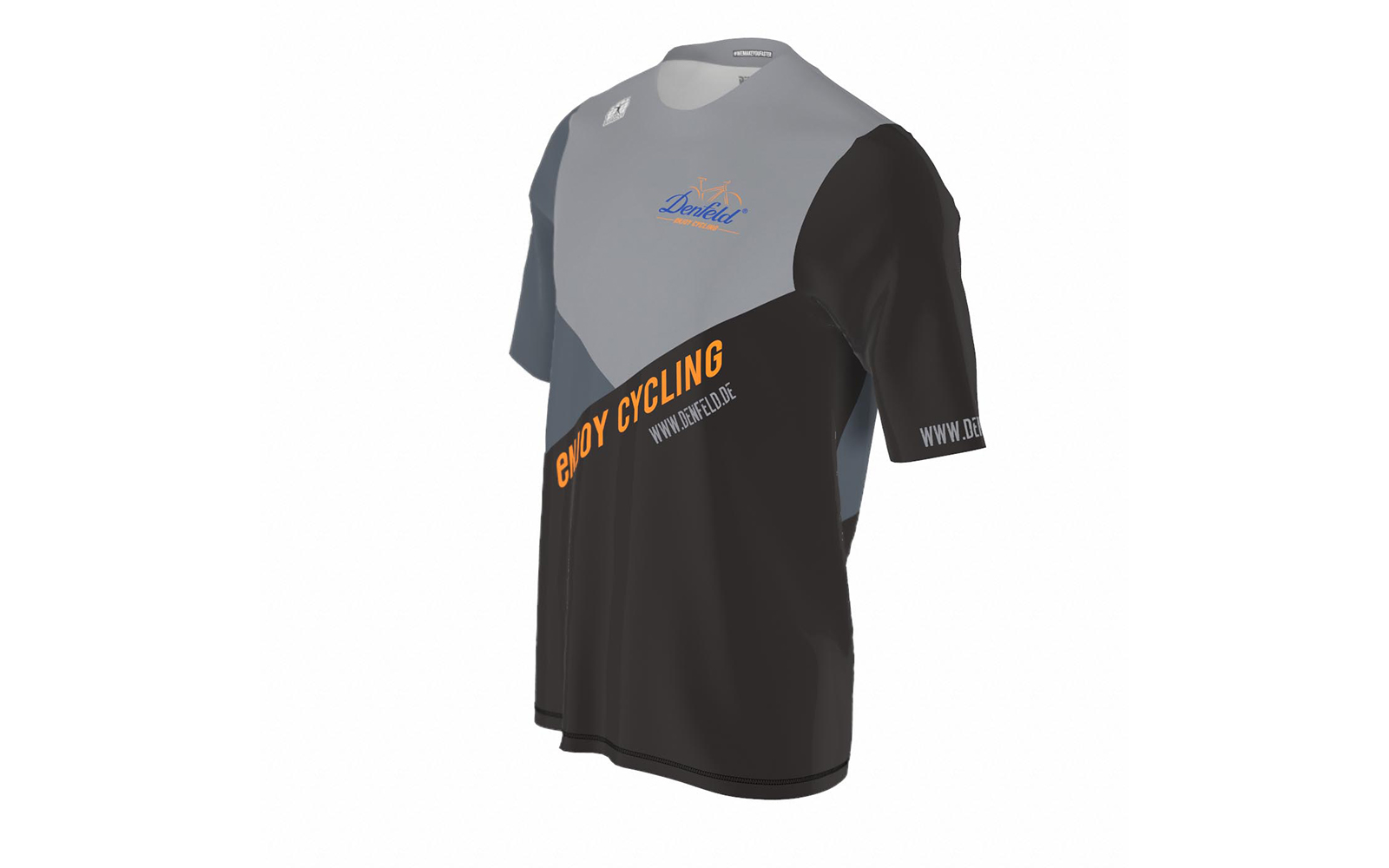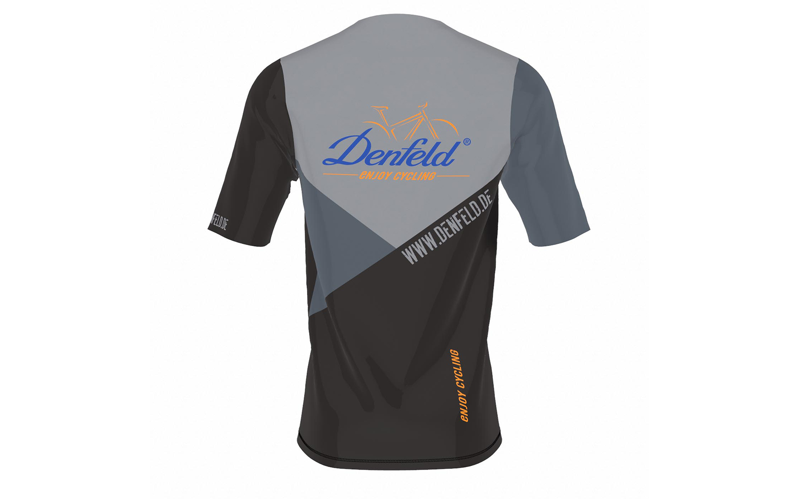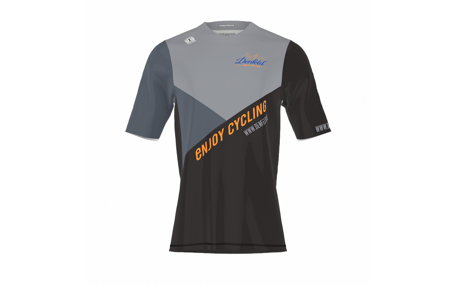 Unser (Lauf-) Shirt im DENFELD-Design. In stylischem schwarz-grau mit orangenem ENJOY CYCLING -Schriftzug.