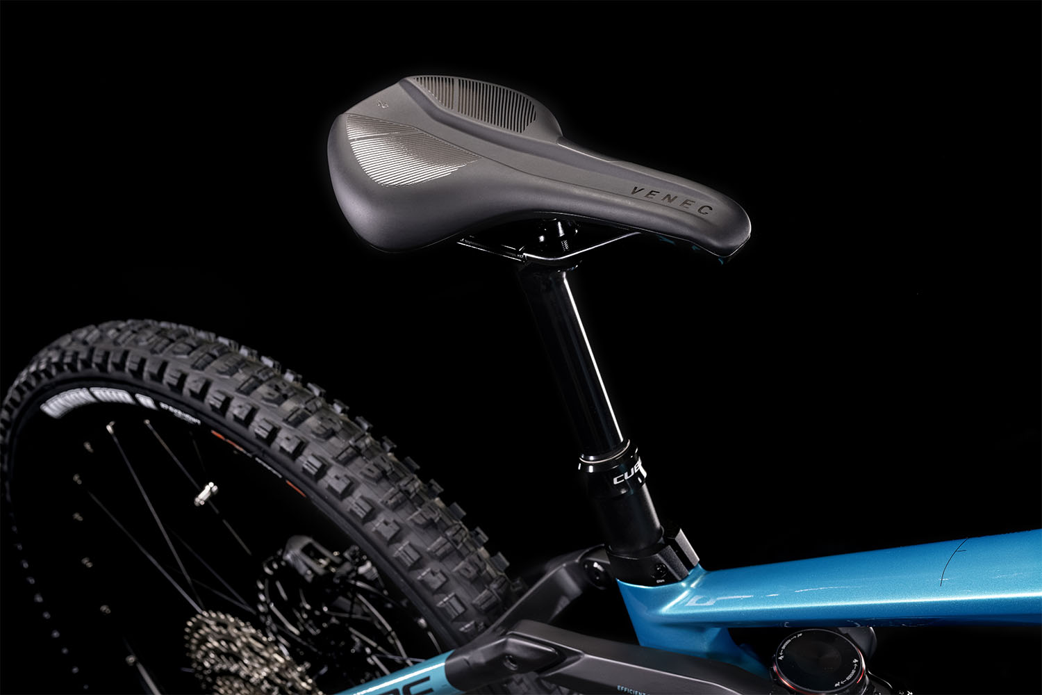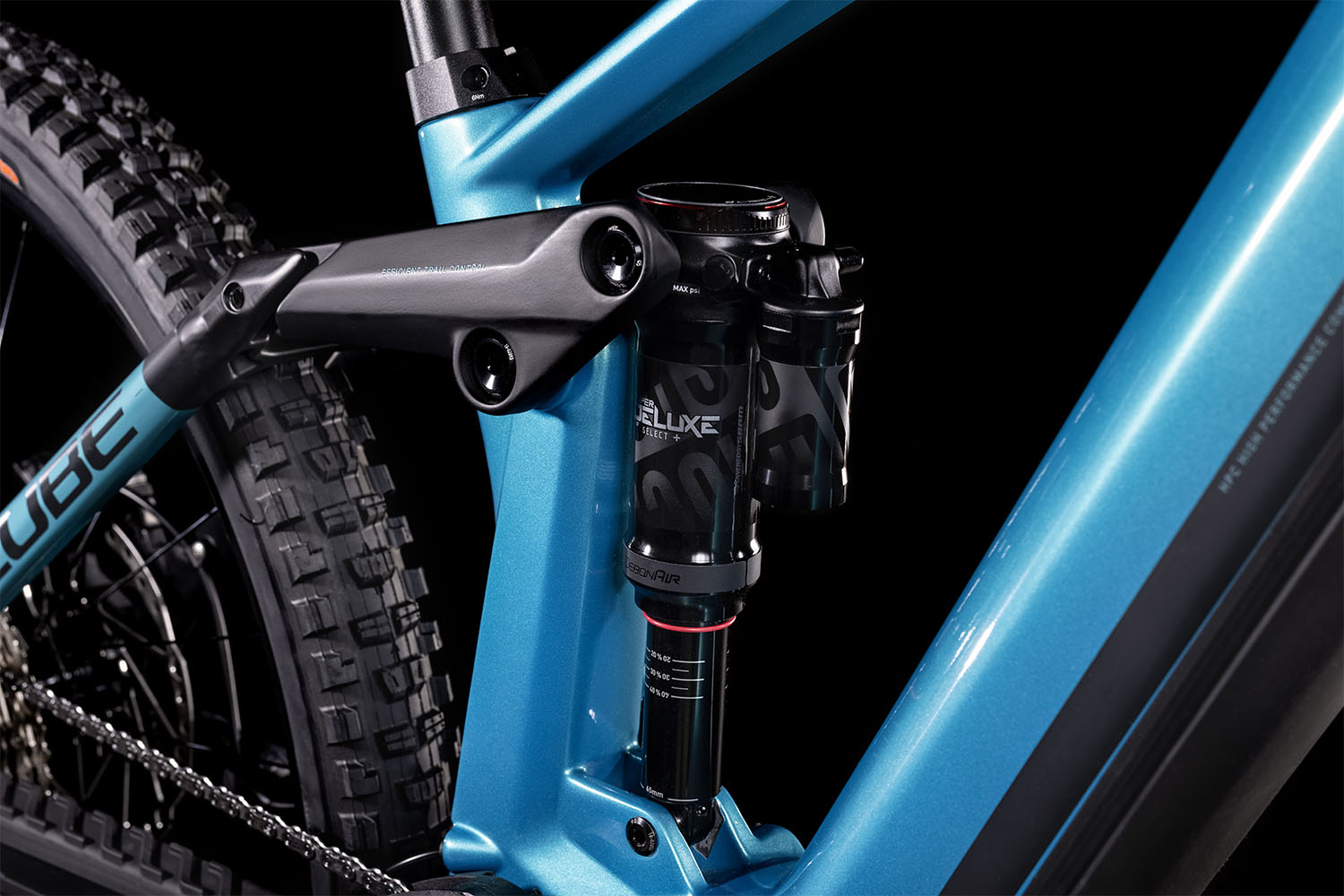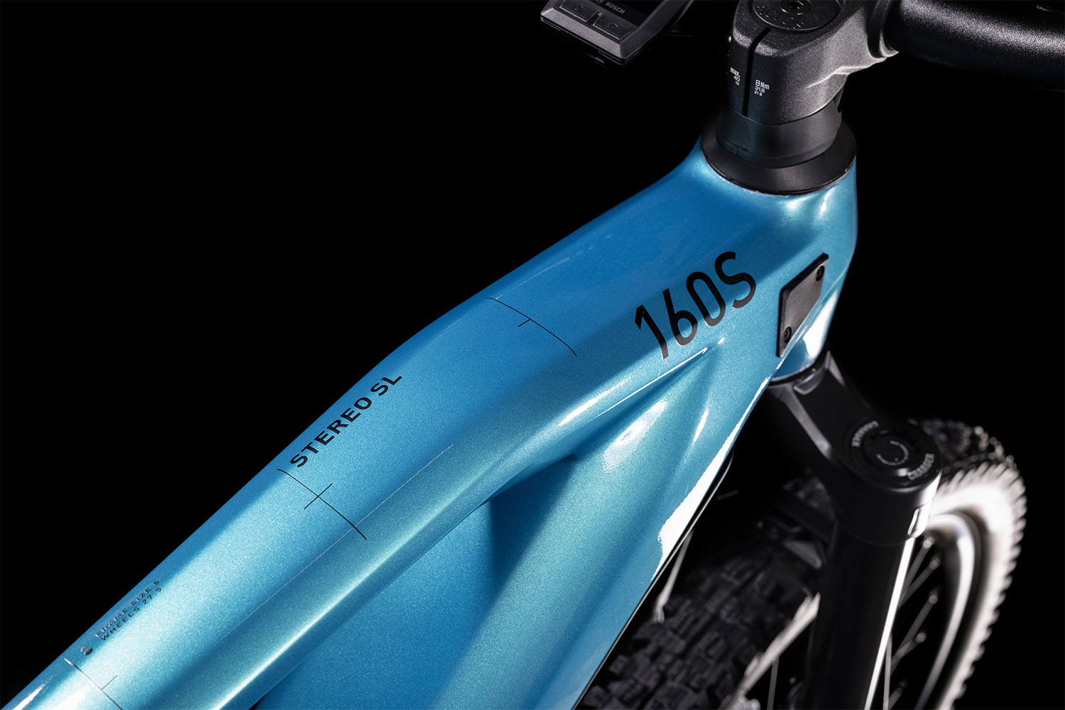Ein stylisches, blaues Carbon-Chassis hat Cube hier rund um den Antrieb entwickelt, die Schwinge kombiniert dazu aus Aluminium. Das Stereo Hybrid 160 HPC SL in der Farbe aquamarine´n´black kombiniert gekonnt 170mm Federweg mit den Vorzügen eines Bosch E-Bikes. Dank Modular Battery System ist der Akku vollständig und fast unsichtbar im Unterrohr des Carbonhauptrahmens integriert, gut geschützt hinter einem stoßfesten Cover. Dazu auf Knopfdruck leicht zu entnehmen, auch das Schloss verschwindet elegant hinter dem Cover. Der Rahmen bietet Montagepunkte für einen Flaschenhalter, außerdem hat CUBE ihn mit einer Trunnion Dämpferaufnahme, extragroßen Lagern, einer Boost 148 Steckachse und einem 1.5 Zoll Steuerrohr für superpräzises Handling. Für wendigen Fahrspaß sorgen die 27,5 Zoll Laufräder.