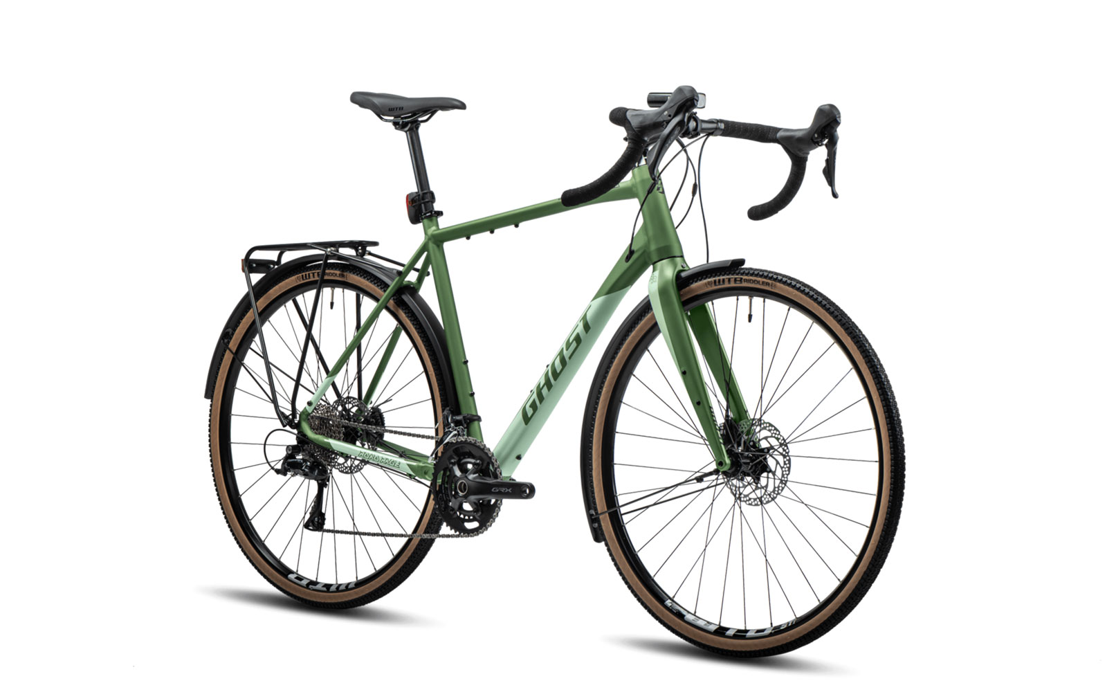 Aluminiumrahmen in Grün-Tönen, bis ins kleinste Detail durchdacht, auch was das Design angeht. Mit Ghost LC Rigid Gabel und innenverlegten Zügen. Flaschenhalteraufnahme ist bedacht worden, breite Reifen passen auch hinein. Schutzbleche und Gepäckträger sind direkt vorhanden.