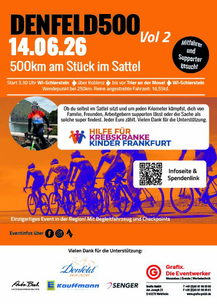 Stolze 500km im Sattel – am Stück – etwa 16,5 Std Fahrzeit – für die „Hilfe für krebskranke Kinder Frankfurt e.V.“. Das war DENFELD500 im Jahr 2024. Zeit für eine WiederholungBereits 2024 wagte unser Kollege Tobi den Versuch, 500km am Stück – begleitet von ca. 30 weiteren Fahrern. Alle gemeinsam – ein Ziel. Ein Tag im Sattel (03:30 Uhr bis 22:00 Uhr). Das Ergebnis: 31.275,25€. 17.800km leisteten die Fahrer in Summe, 29 Fahrer/innen haben die 500 gefinisht. Es schlug große Wellen, hinterließ Gänsehaut und Bewunderung