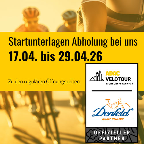 Alle bis einschließlich 31.03.26 gemeldeten Starter der ADAC Velotour, haben die Möglichkeit ihre Startunterlagen zwischen 17. und 29.4.26 bei Fahrrad DENFELD in Bad Homburg abzuholen. Ausweis & Abholbestätigung nicht vergessen!