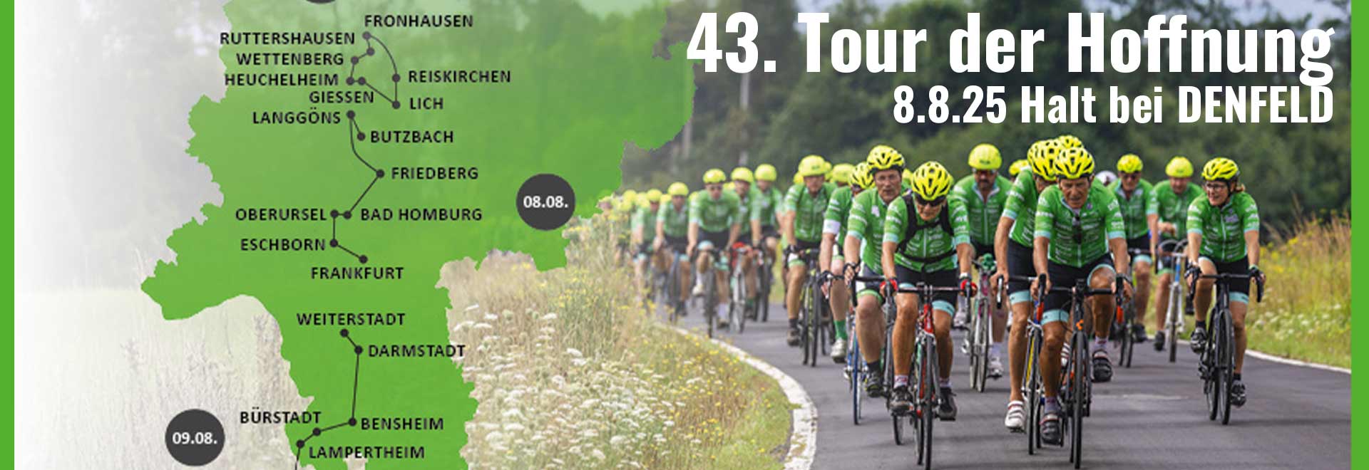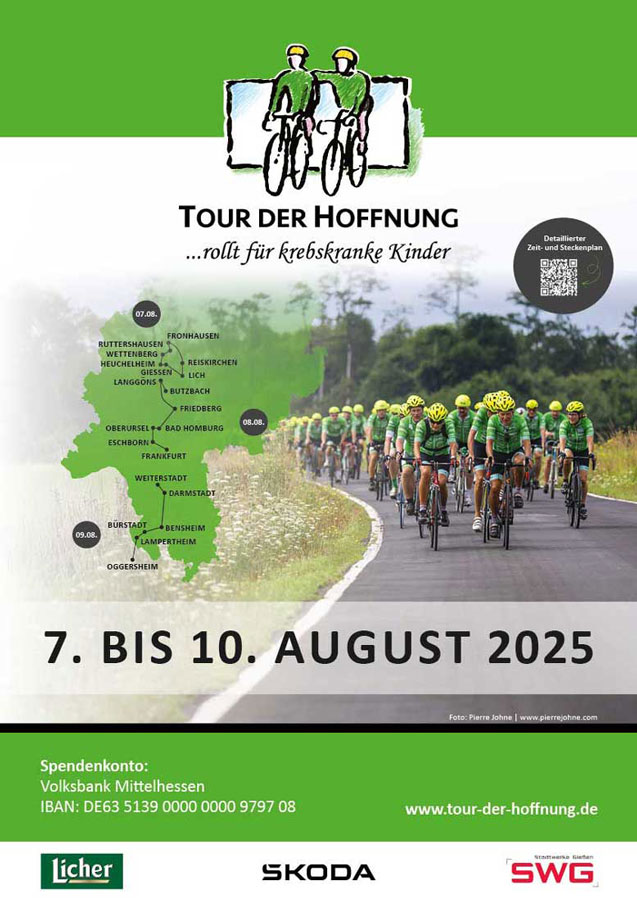 Tour der Hoffnung – Radeln für den guten Zweck. Etwa 160 engagierte Radfahrerinnen und Radfahrer setzten sich bei der Tour der Hoffnung in Bewegung. 240 Kilometer in drei Etappen. 2025 rollte die Tour durch Hessen und legte einen Abstecher nach Rheinland-Pfalz ein. Die Benefiz-Radtour, die seit über 40 Jahren durch Deutschland rollt, sammelte Spenden für krebskranke Kinder und unterstützte damit wichtige Forschungsprojekte sowie die Arbeit in Kinderkliniken.